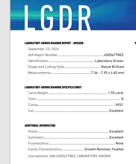 1.55 Carat Round Lab Grown Diamond, Color D + TRIPLE EXCELLENT , certificate GIA