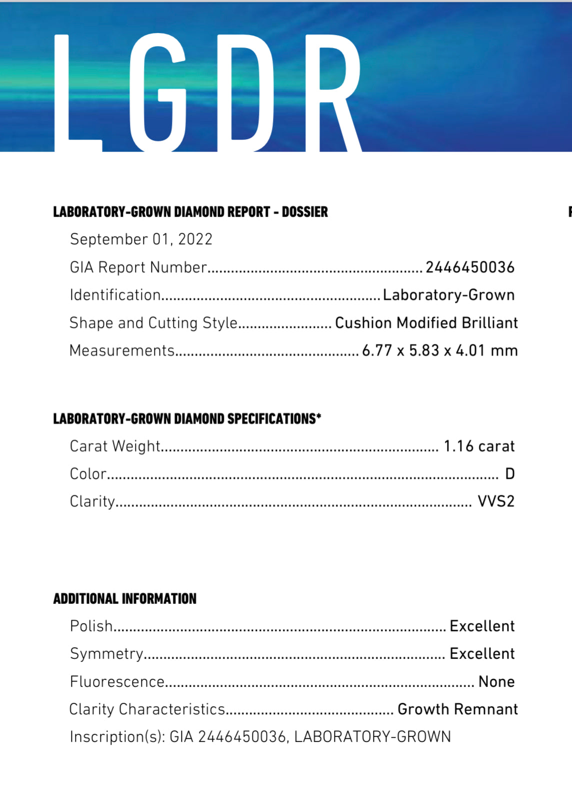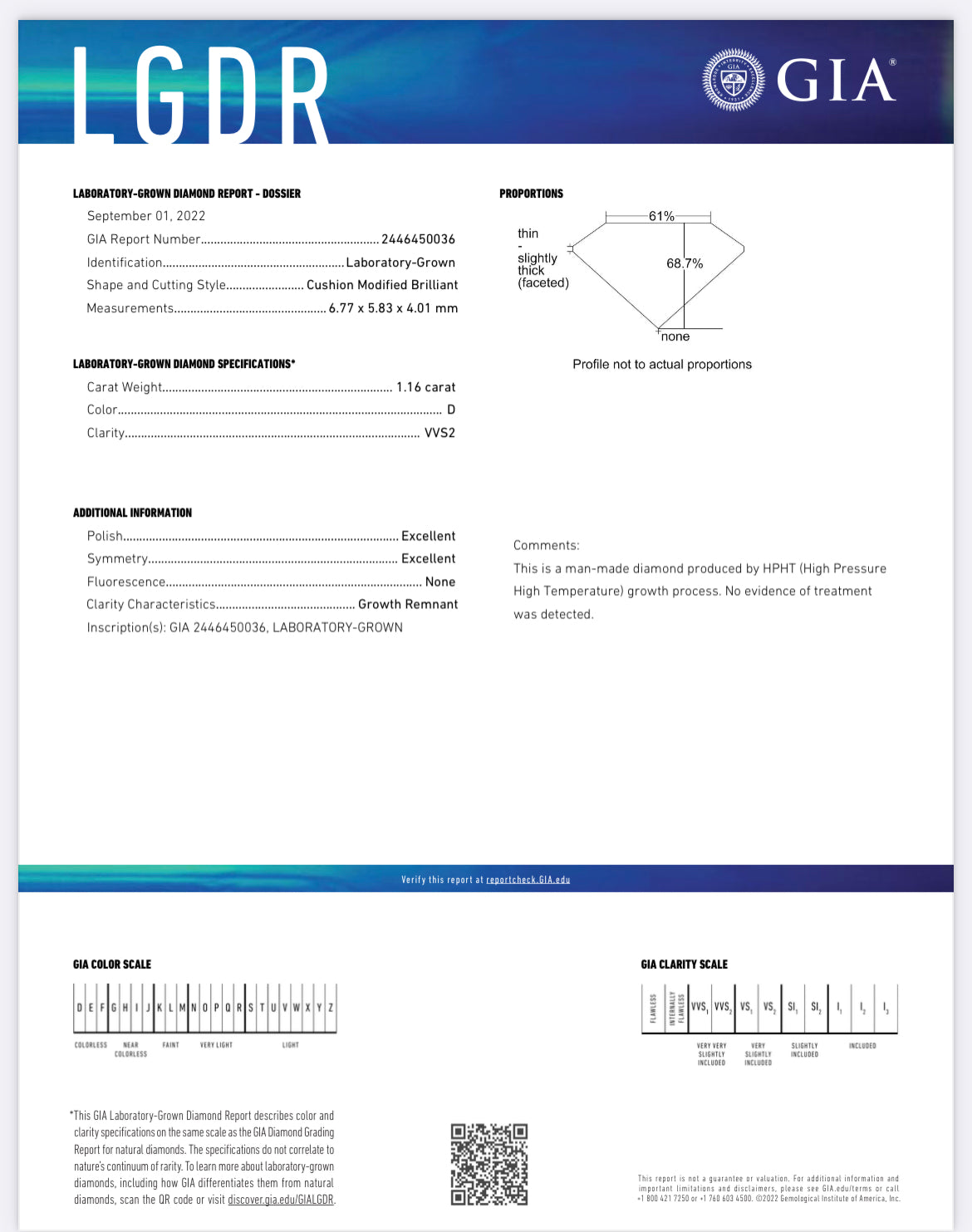 1.16 Carat Lab Grown Cushion Diamond. GIA 2446450036
