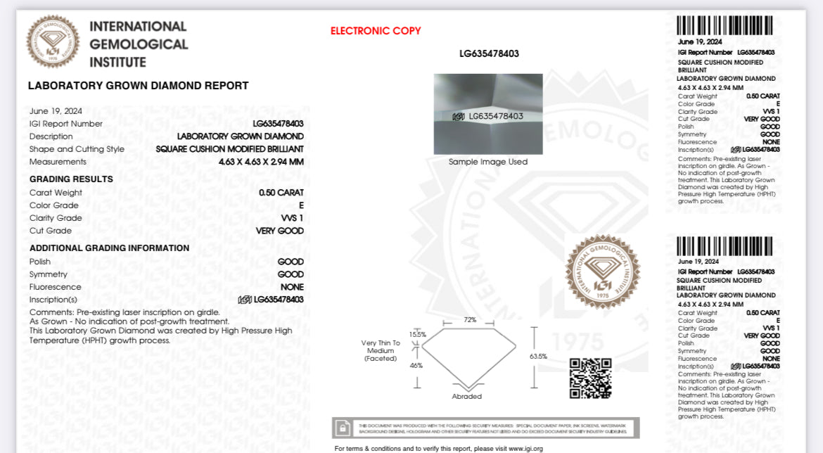 .50 Lab Cushion Cut Diamond , Color E , Clarity VVS1 - IGI LG635478403