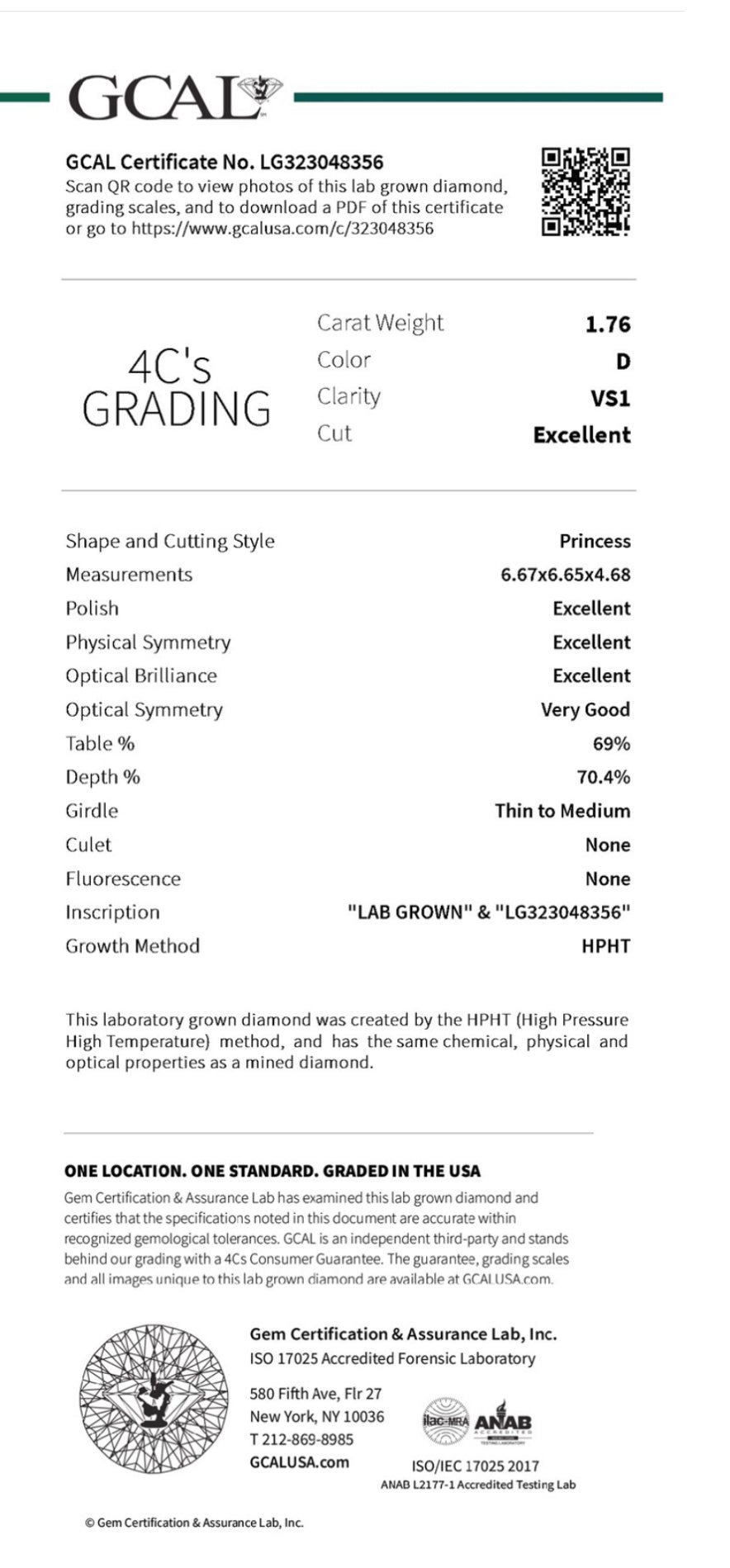 1.76 Lab Grown Princess Cut Diamond , Color D , Clarity VS1 -GCAL LG323048356 + Triple Excellent