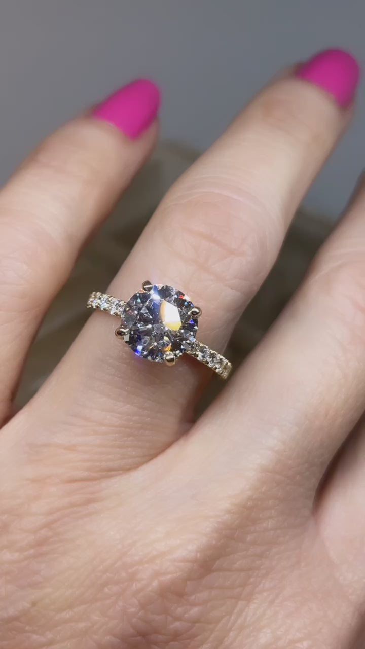 New Custom design in 14k Yellow Gold Ring with a all Lab Diamonds Shank set half way and Pave Diamond On Setting & along Each Prong and Side Bar