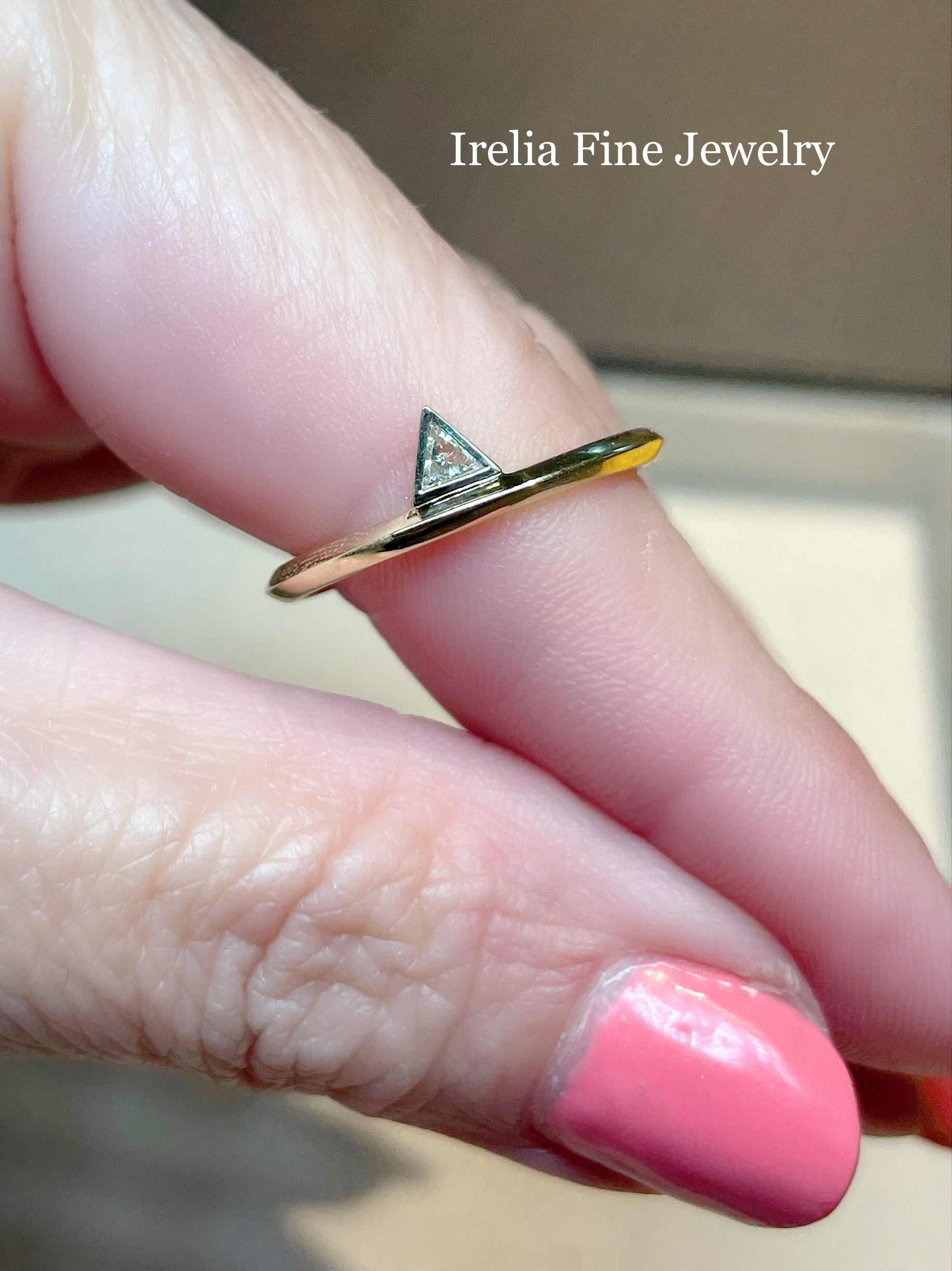 14K Yellow Gold .06 CT Natural Diamond Stackable OR Wedding Band Comes set with a 3 millimeter trillion Natural Diamond , that is bezel set.