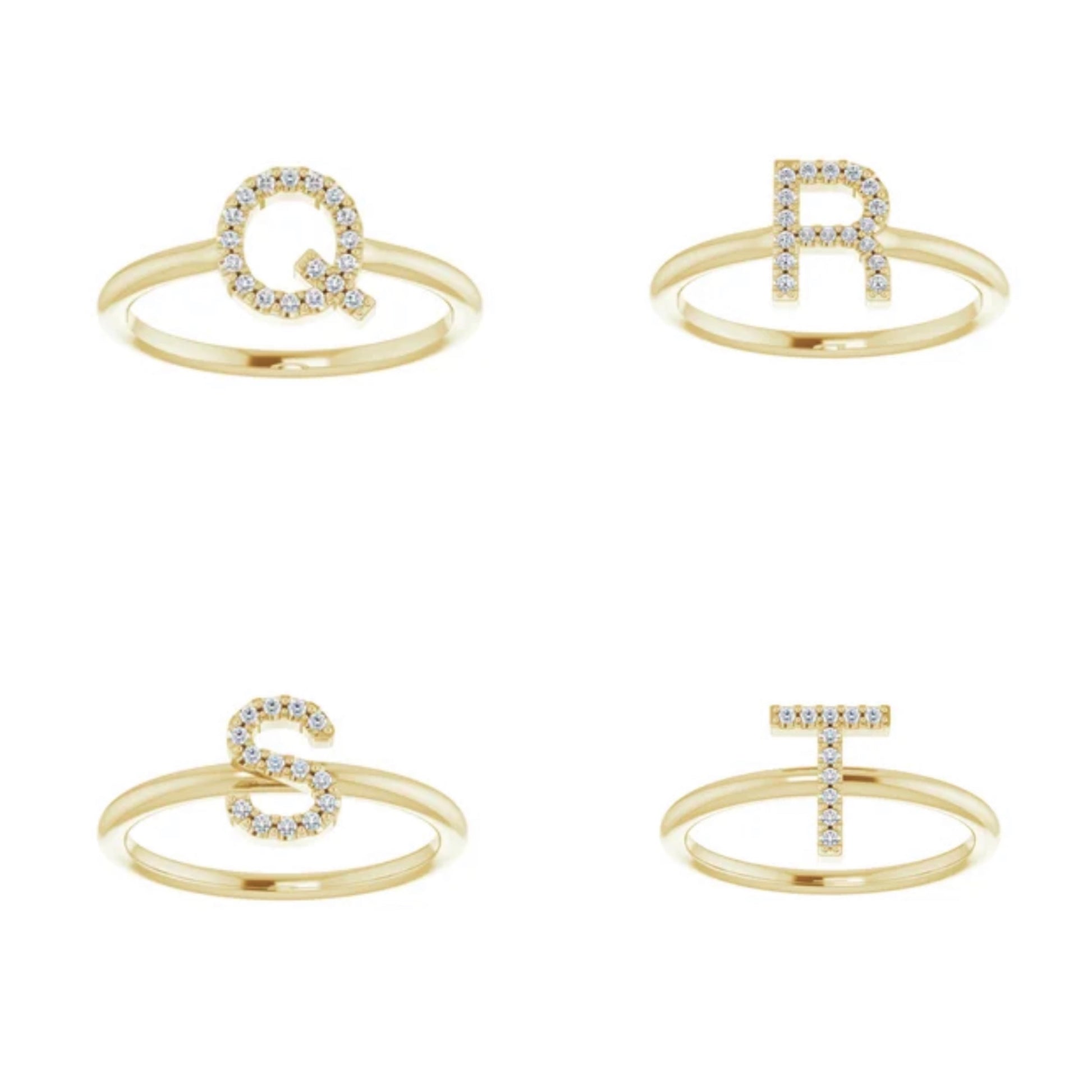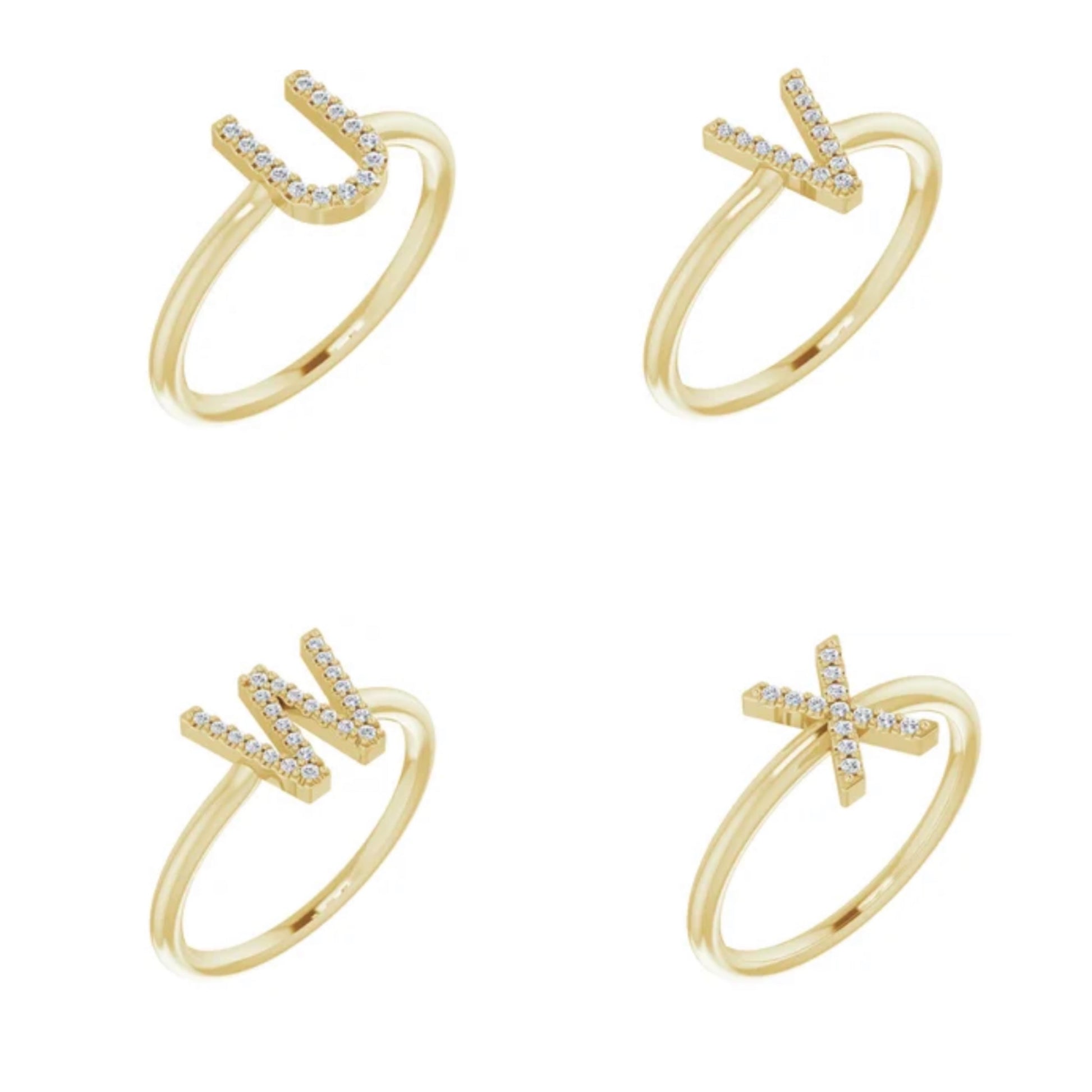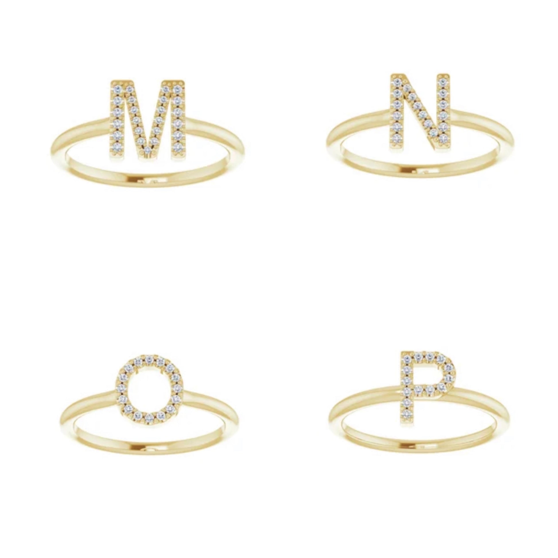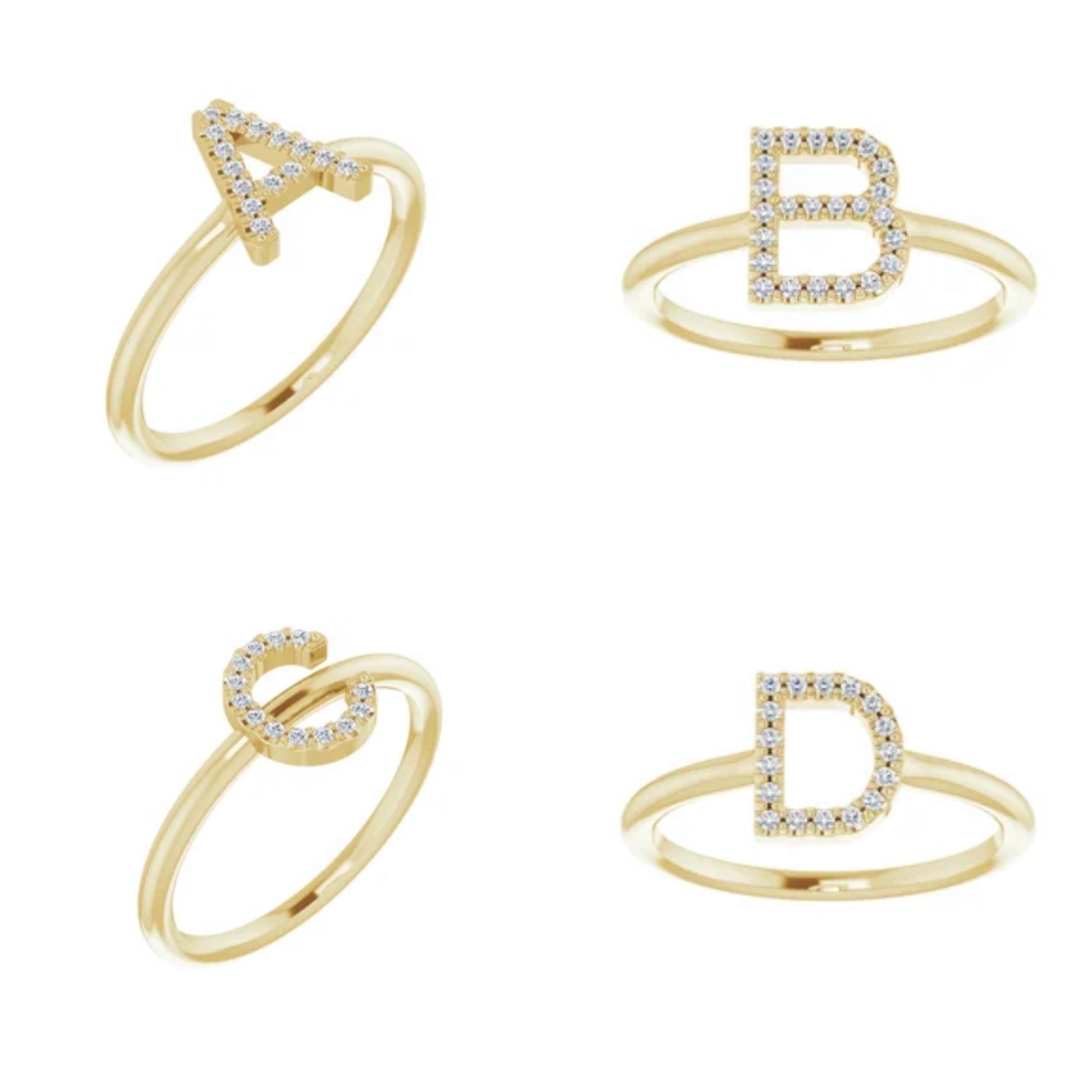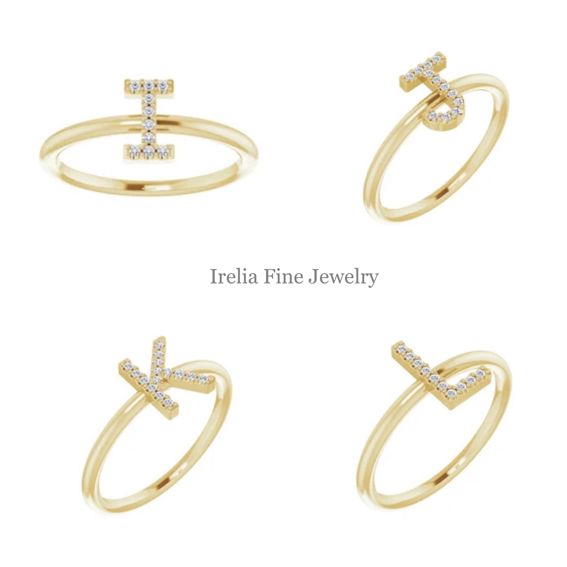 Irelia's personal favorite is this Diamond Initial Ring. Pick your Letter A to Z. The Ring are set with natural Diamonds measuring 1.00 milimeter round , color G-Hand clarity SI1, daimonds carat total vary in each letter from .06 -.08
