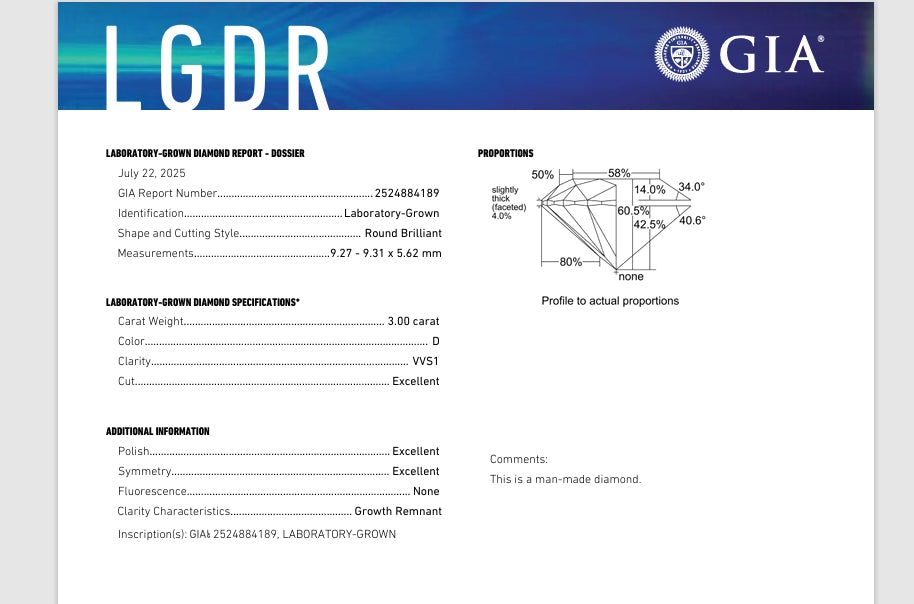 3.00 Carat Round Lab Grown Diamond, Color D, Clarity VVS1 GIA