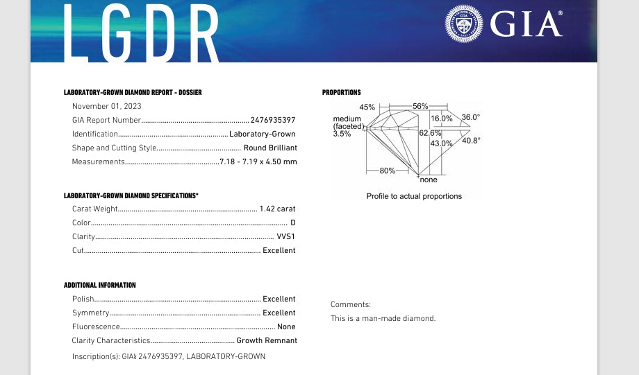 1.42 Carat Round Lab Grown Diamond, Color ED, Clarity VVS1, GIA TRIPLE EXCELLENT