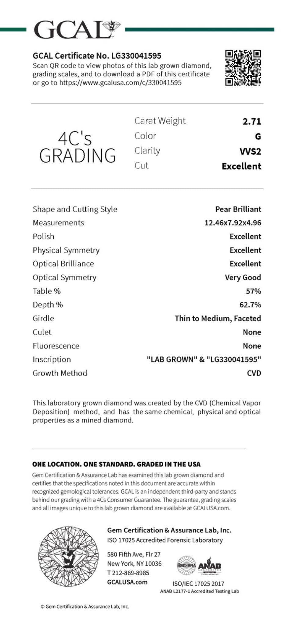 PEAR 2.70 Carat Lab Grown Diamond. IGI Certificate LG330041526